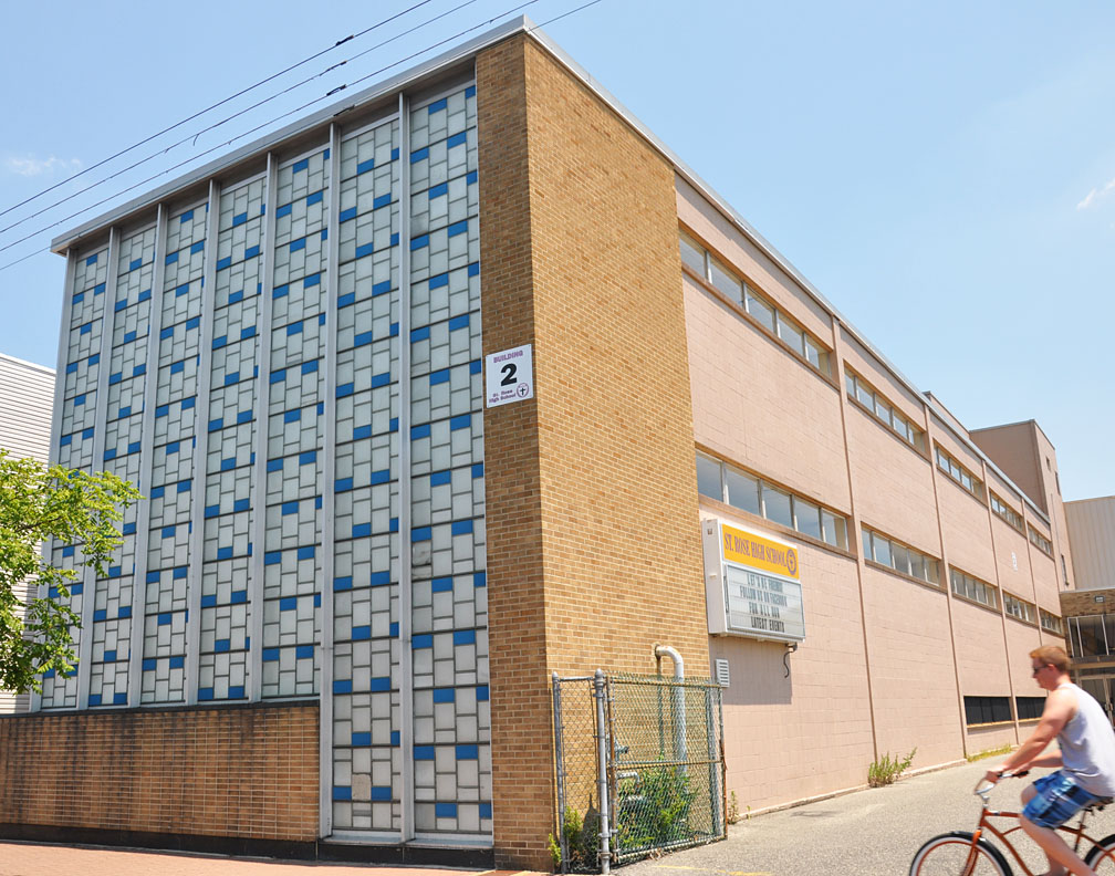 From Belmar: the St. Rose High School. A little midcentury number with ribbon windows on the side and Mondrian-ish windows in front. The front windows are textured clear glass (like headlight material) set in front of plastic paneling. Maybe they are or were backlit?