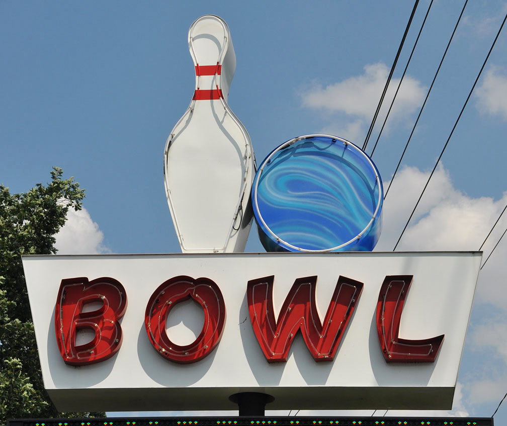 From Lakewood Township — the Ocean Lanes. I cropped & spared you the modern message board below. This bowling alley opened in 1959. This is probably the original sign with some updating. Probably new letters and painting — and maybe replacement panels. But I’d guess at least faithful to the original.