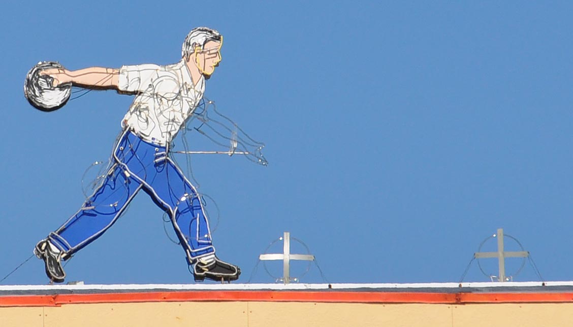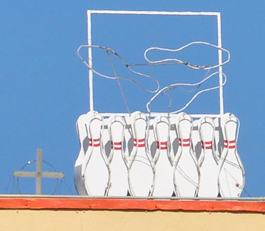 And this sign in Des Moines — how could I have never seen or heard of this Plaza Lanes sign before? It’s absolutely incredible. Unfortunately, impossible to shoot in the morning. Here’s the non-sunny side from today. Yes, rather like the Sheridan Lanes sign in Tulsa — but far bigger and spans much of the roof. I don’t know if it’s still lit and has animated rolling bowling balls & crashing pins. Really a gigantic work of art.