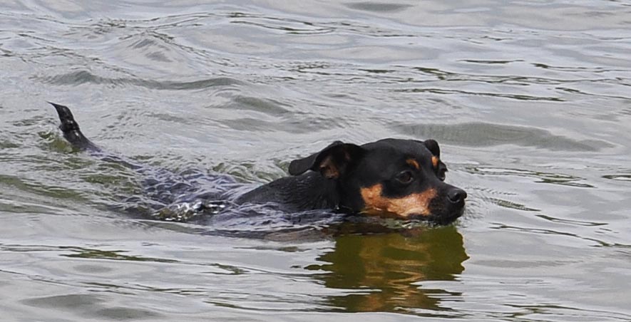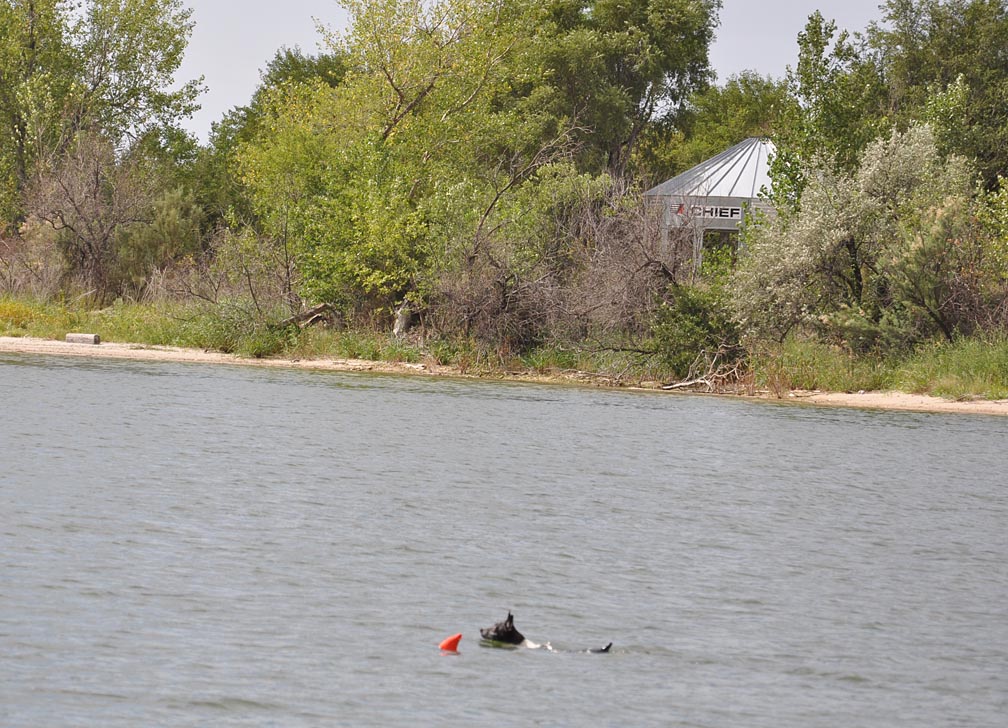 Lest you forget about my roadtripping buddies — time for a swim in the Platte River in Kearney. Gremmie motors towards a floating biscuit chunk: