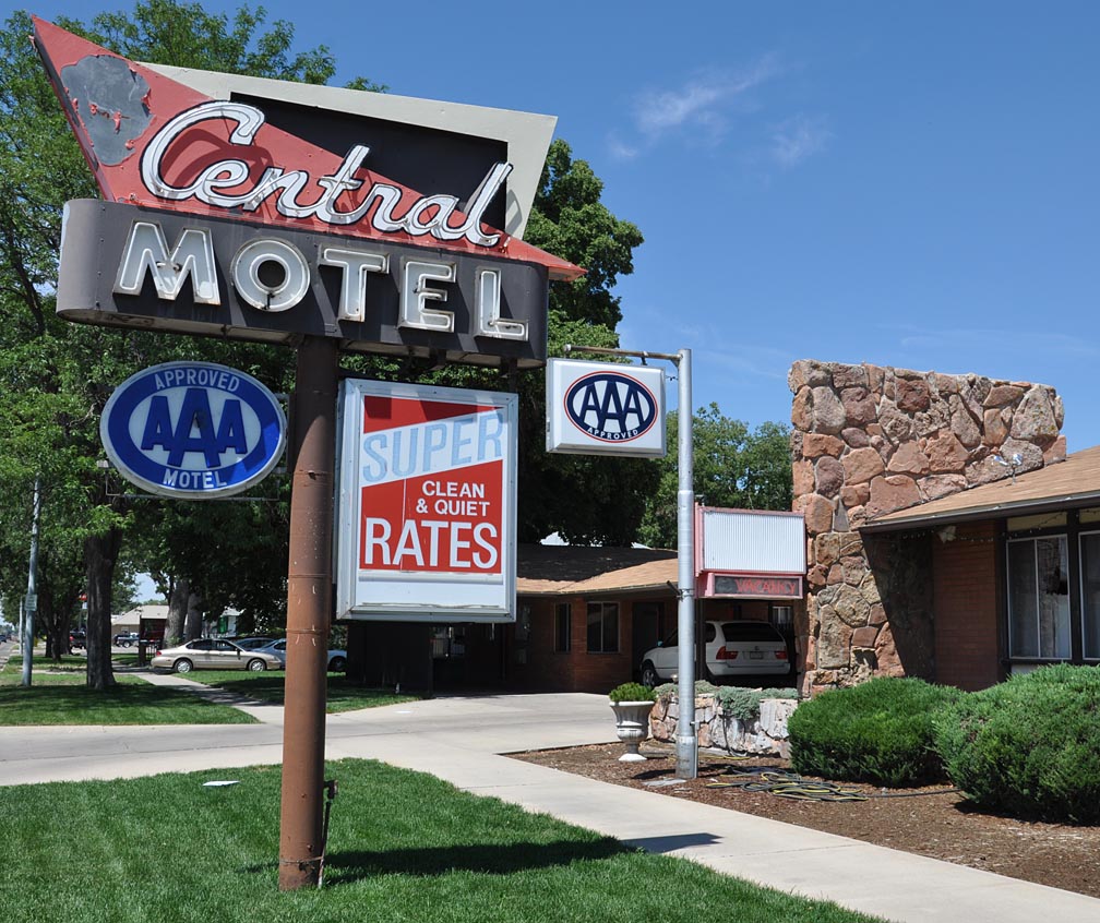 From Fort Morgan. Apparently, one pole sign was not enough. The other one there to the right has a more modern AAA-approved sign. I can’t imagine that the second sign was built for that. Must’ve been some other “announcement”? Like “pool” or “color TV” or something?