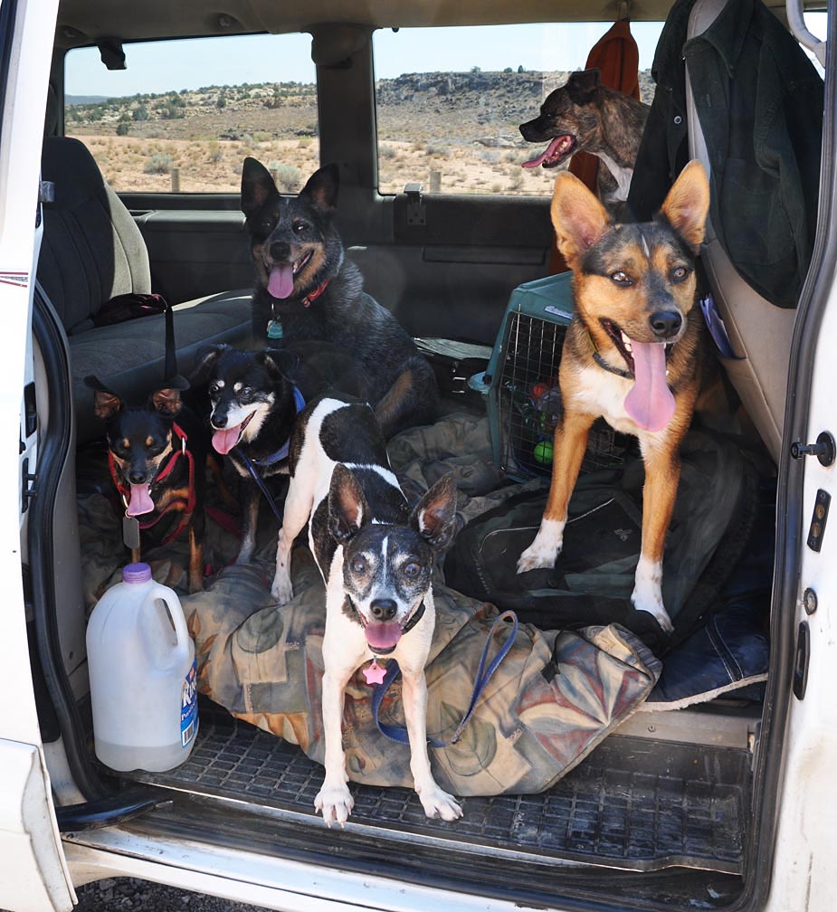 And here’s Sparkle loaded up with my guys and two of Sue’s four dogs. The big ones are hers — but you knew that. This was after a big hikie — so their tongues were down to their knees. It was h-o-t: