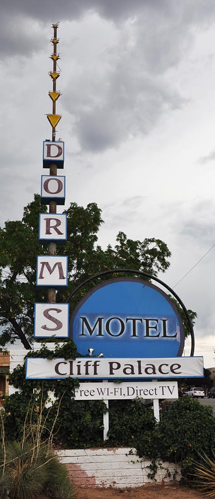 A couple of signs from Blanding — my bet is “DORMS” read “MOTEL” originally (the right number of blocks) — and who knows what the original name was. What turns me on are the descending triangles going from itty-bitty to big. Weather was changing her as you can see. From so-so to worse: