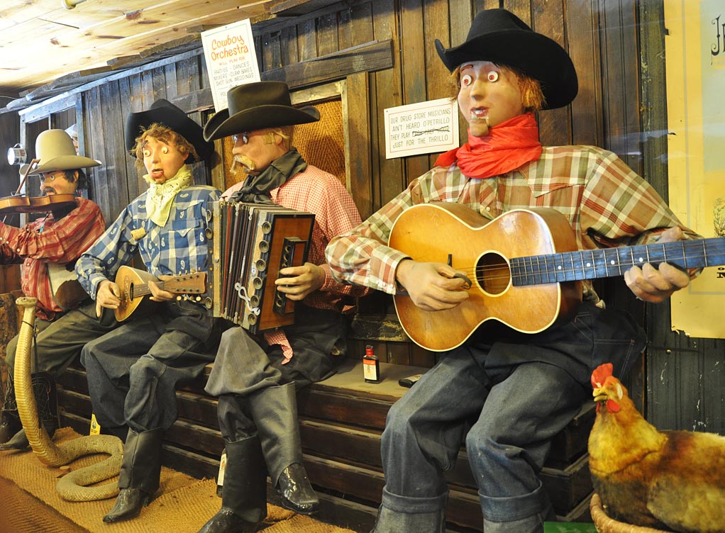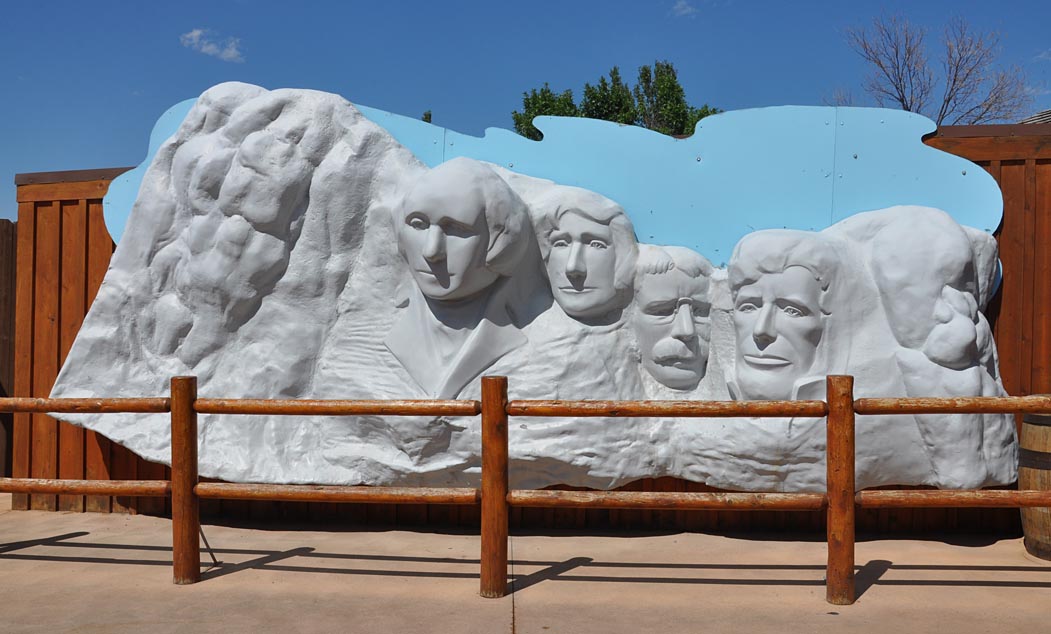 Photo-ops — like this faux Mount Rushmore and a saddled Jackalope for you to climb on.