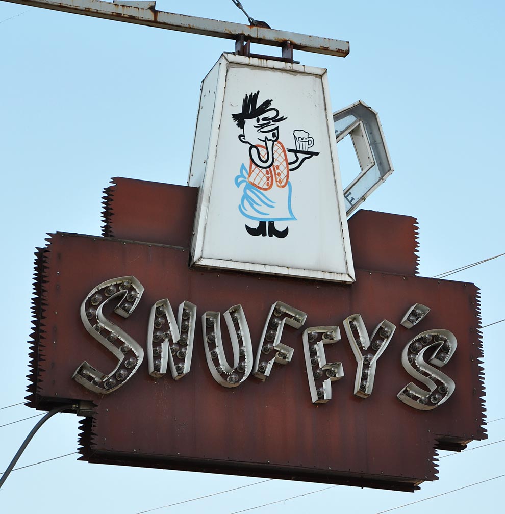 It wasn’t on my list for this trip but I had to go check on my favorite sign in town. I was horrified at first when I didn’t see it. But then turning around, I spotted it next to the building in the parking lot. So, I had to go inside and ask what was up. I spoke with the owner who explained the building had been hit by a tornado (ah, yes, big blue tarp on one corner). And that they were moving in March to a new building in an industrial park. He will keep the sign and most likely display it inside the office. He seemed very interested in restoring it. I expressed my concern that if he did that he should just repair the neon and maybe touch up the paint but not repaint it. The patina is really what makes the sign — makes it vintage, historic and visually appealing. He seemed to agree. Fingers crossed. I emailed Tod (American Sign Museum) to see if he knew of any historically sensitive sign shops in the area. The owner said the sign is from the late 1950s and was originally animated somehow.