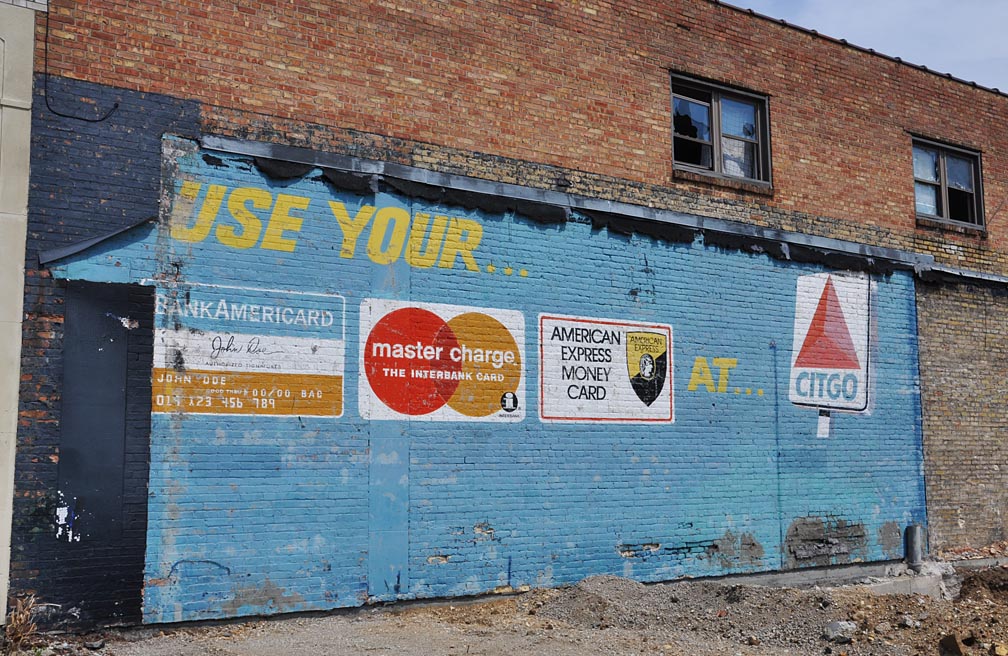 On to Illinois — from Rockford. It appears a building was recently reduced to rubble — a vacant lot where I’m standing & shooting. Thus exposing this bit of painted advertising. Amazing that these big three credit card companies still exist — just with different names: