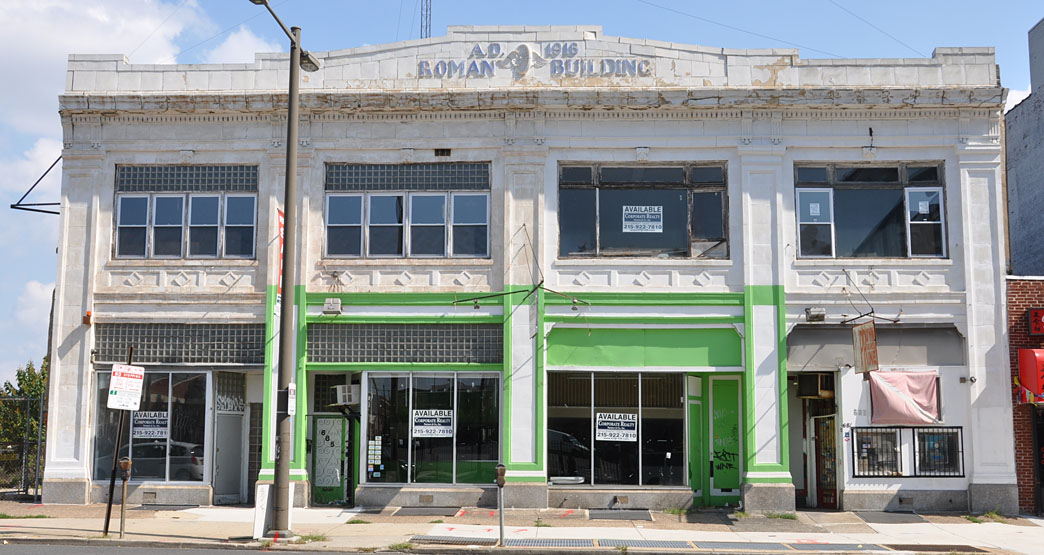 One last shot before crossing the river — from Mount Ephraim. Probably not a paint store originally. Bays next to it make me think it was a car dealership or car-related sort of business. Note the groovy triangulated front windows as well: