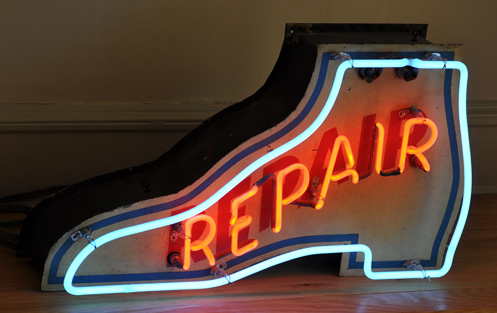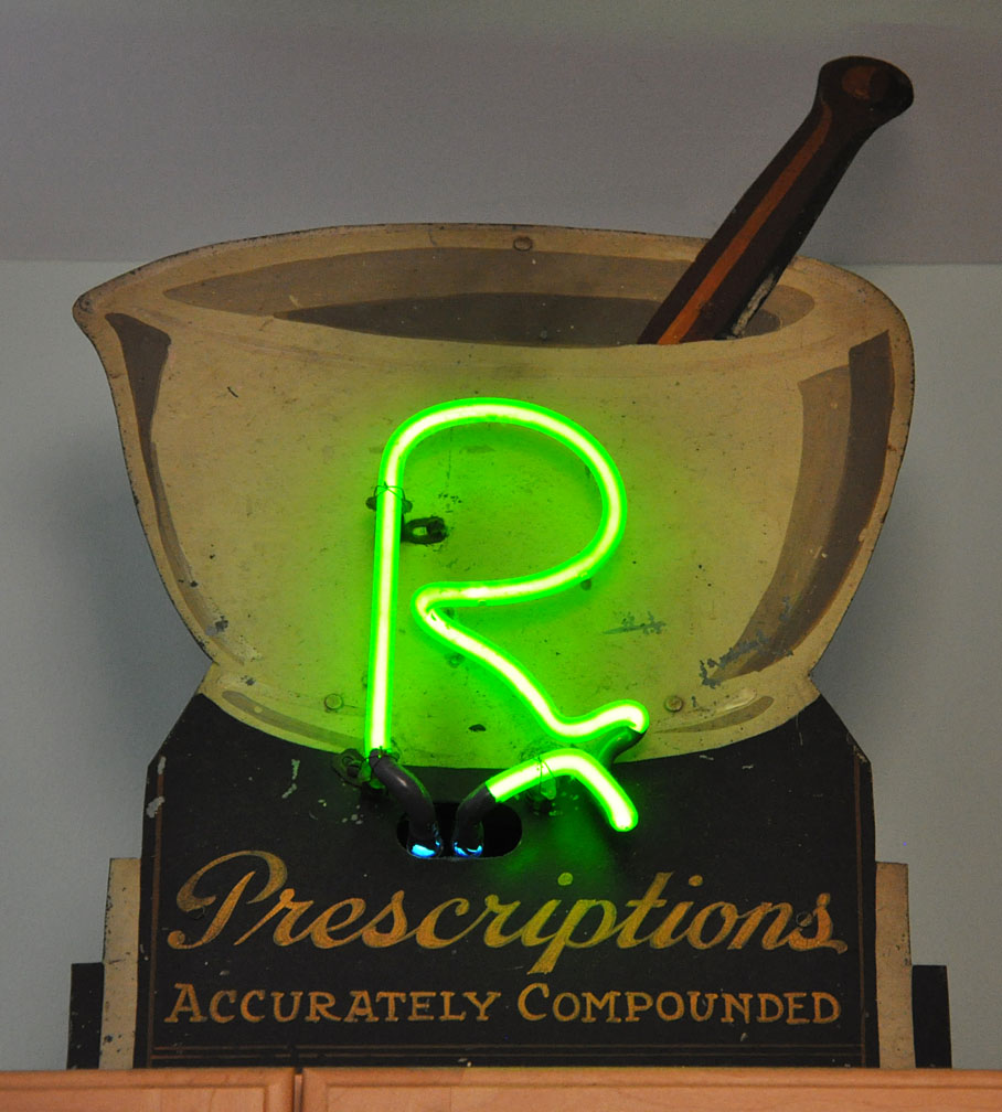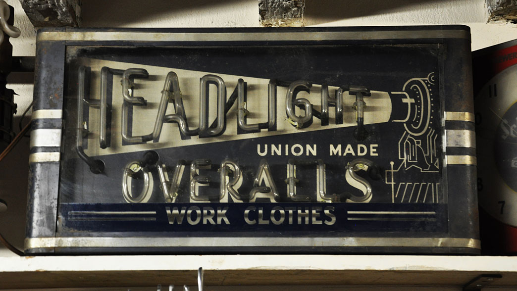 Len gave me a little tour of some things in his personal collection. Embossed porcelain letters. These signs were mass-produced. Here’s one in Jefferson, TX with the glass and neon intact: