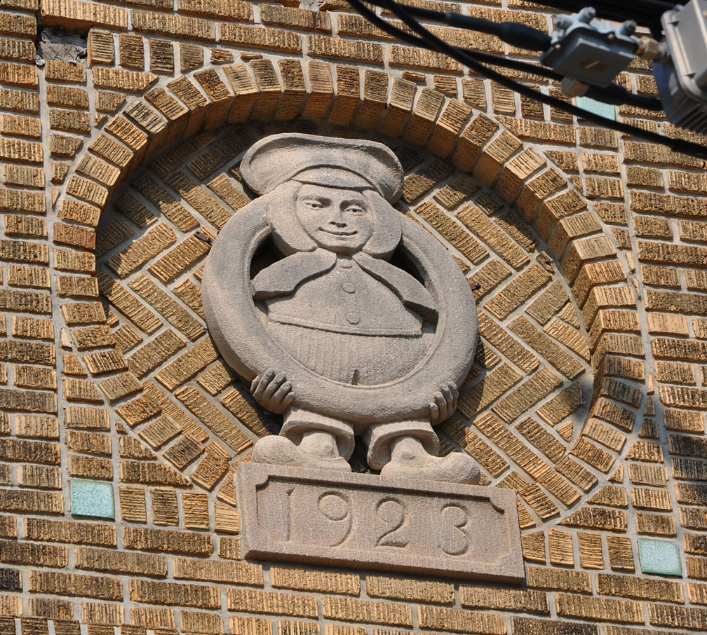 A cute Dutch boy holding — a tire? Maybe a garage: