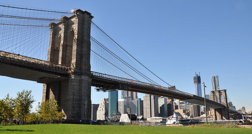From the Brooklyn waterfront — the Brooklyn Bridge. The tallest building in the distance is the new, nearly finished World Trade Center: