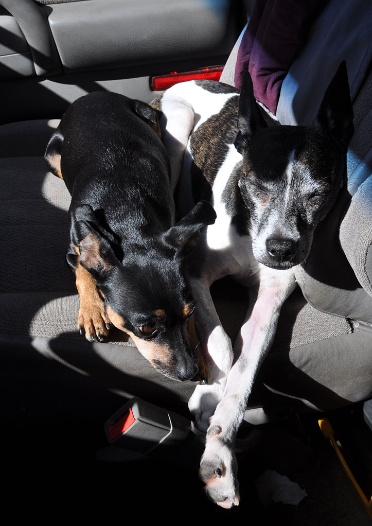 Two of my passengers basking in the front seat with non-stop sun. Grem (on the left) never really sleeps. Hardly ever. The seniors were snoozing in the back.