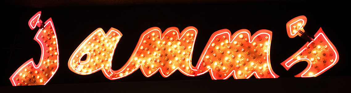 I don’t know if this Jamm’s sign on display is vintage or new — but it is a killer. Neon outlining and then the bulbs of each letter fill up in sequence. Then, with the letters full, the sign goes into that dizzy scintillating mode. It’s hypnotizing.