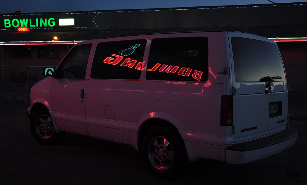 Oxnard is where most the interviewing at the agencies takes place. So, one night I hung around long enough (went to Port Hueneme’s Kiddie Beach which is great for dogs) and got the Wagon Wheel Bowl sign. Here’s Sparkle basking in it: