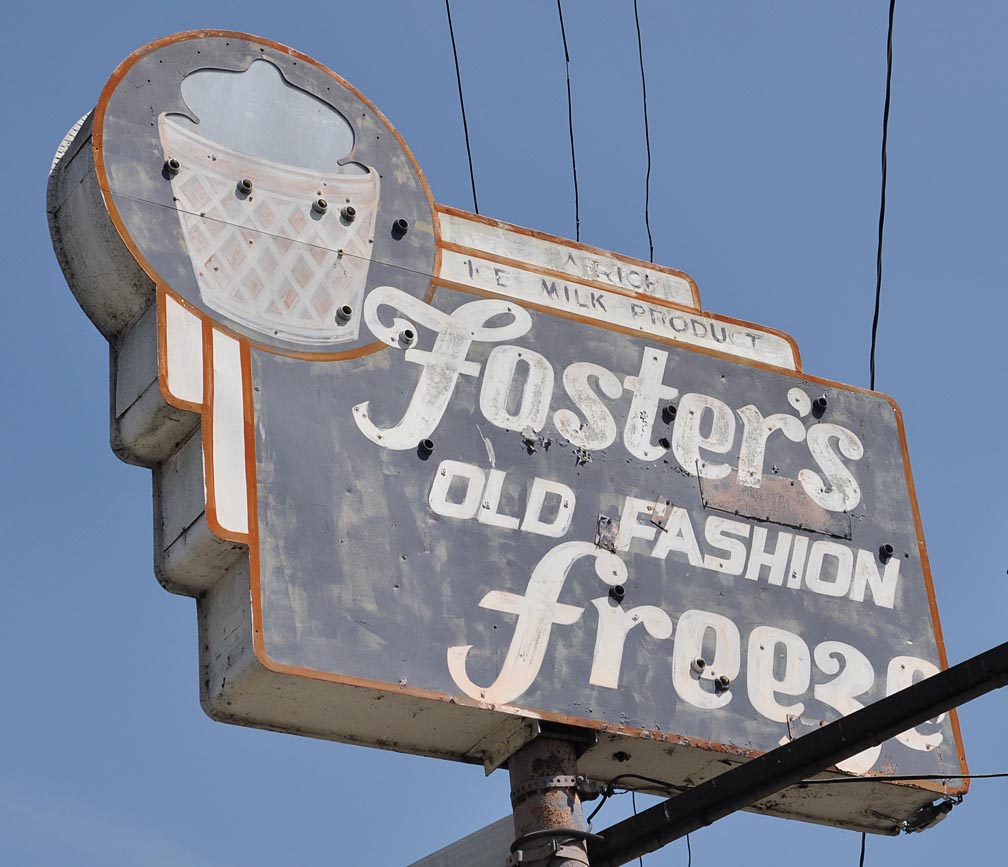 What’s unusual about this Foster’s sign is the ice cream part. The metal seems to have been cut out and a plastic piece inserted — which I assume was backlit. For more Foster’s buildings and signs, I’ve got this page at my site: