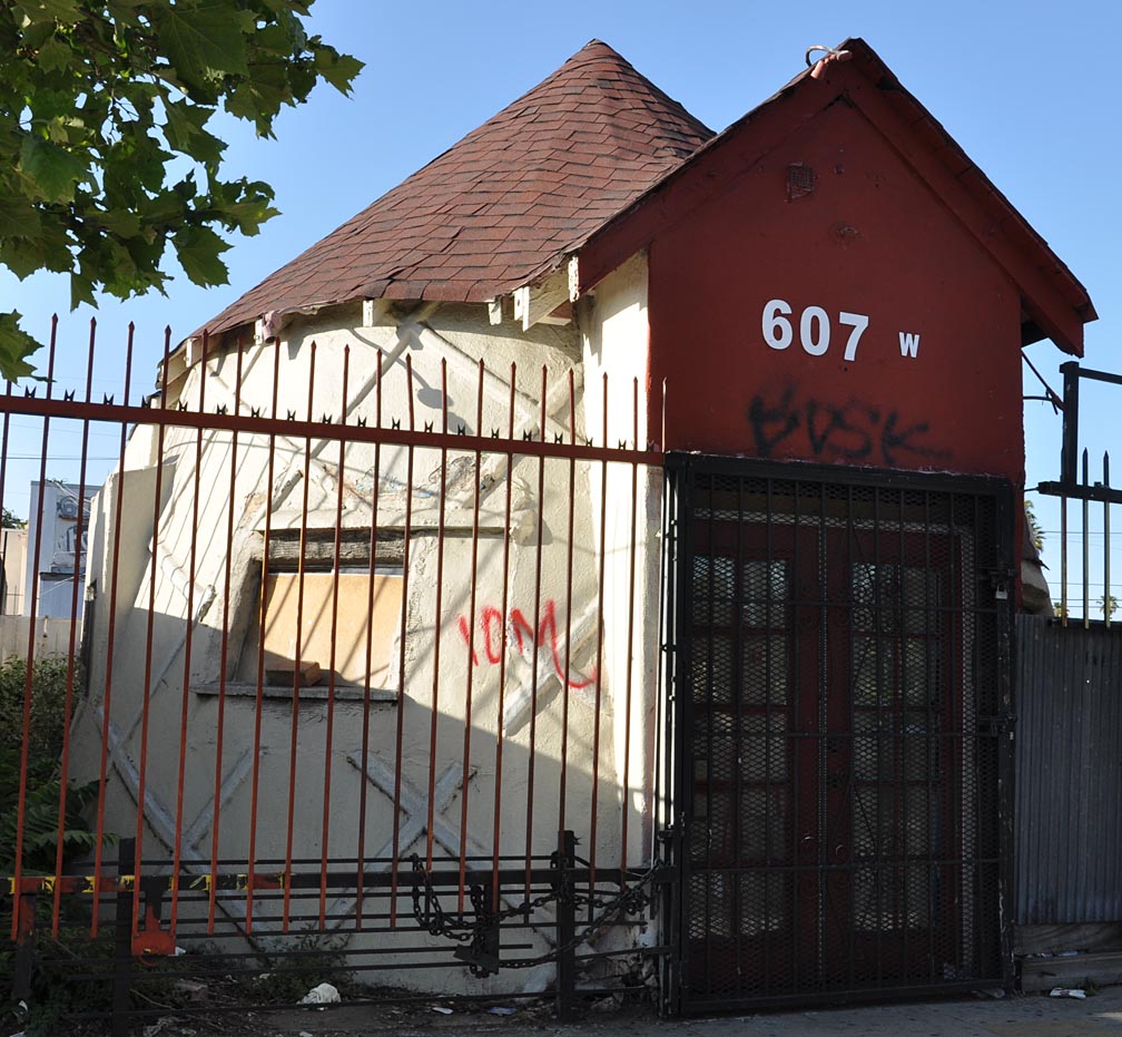 This one in L.A. really intrigues me. The waffle cone patterning reminds me of a Twistee Treat — though entirely the wrong shape. More like a teapot — but no spout. The building is round — or, more accurately, conical. The hideous door has to be a later addition: