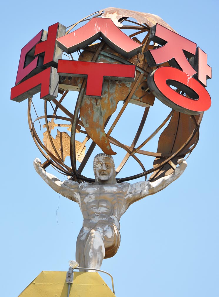 From Van Nuys. An Atlas statue originally from a Jack LaLanne’s European Health Spa. This one adapted for the Duk Su Jang Restaurant and installed on the roof. There are still a number of these statues left around the country — though I don’t think any of them are associated with fitness centers any more. Here’s one I shot in Columbus, OH in better shape — advertising for Atlas Construction:
