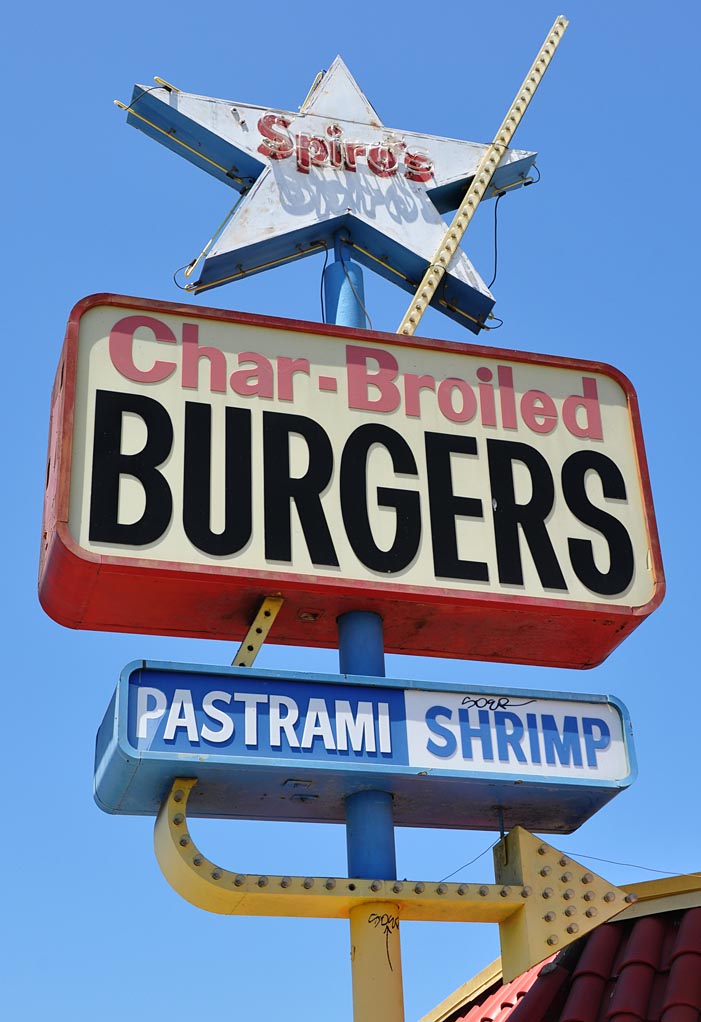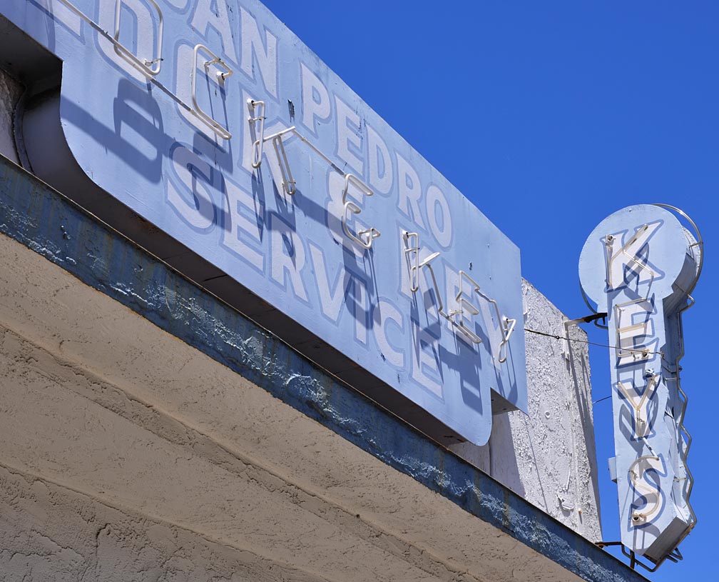 From San Pedro. According to the counter guys, this was originally the Hamburger Hut — established in 1936. And you can see some ghosting on this sign and holes for the neon that might match that name. But I’m suspicious that this was a hot dog place with the Dachshund featured so prominently. A San Pedro on-line source does show a Hamburger Hut at this address in the 1950s — so maybe the guys are right about that. This sign is more typical of the 1950s than 1930s.