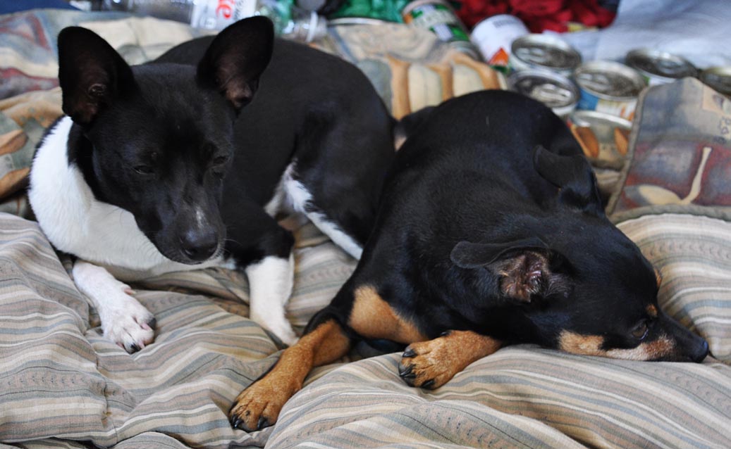 Exhausted by mid-afternoon — thank god! It was a VERY noisy morning (mucho barking). An over-the-shoulder, at a red light shot of the new kid (Griz) and Grem.