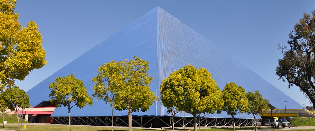 The Walter Pyramid at Cal State University Long Beach — built in 1994. This one would probably shoot better on a cloudy day. But it’s very mirage-like that blue on blue: