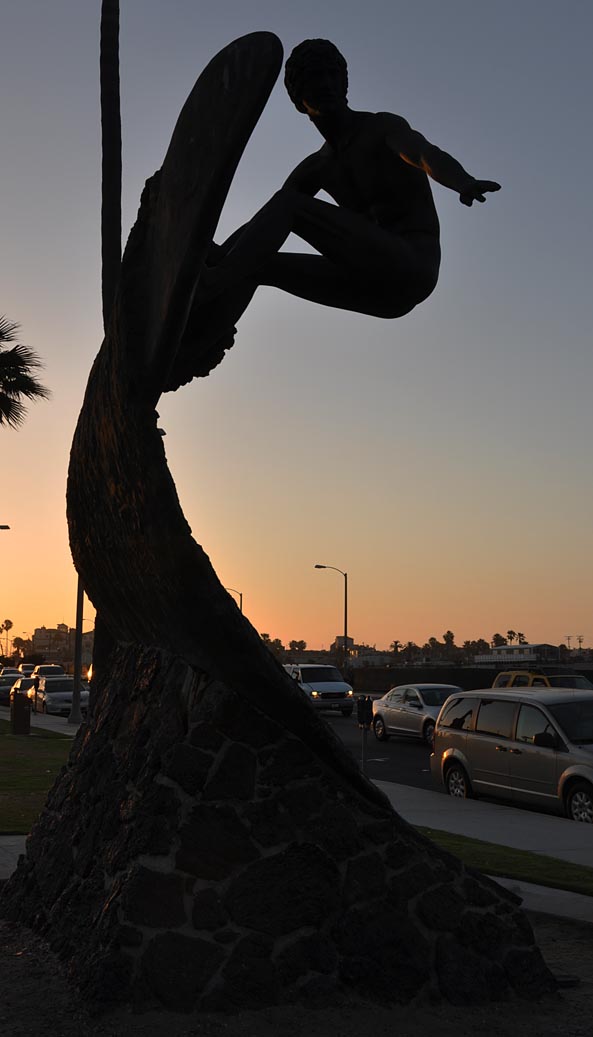 At day’s end, the dogs were treated to the huge, LEGAL dog beach in Huntington Beach. After that, too late to shoot anything else. But I thought you might like the sunset silhouette of the Naked Surfer statue: