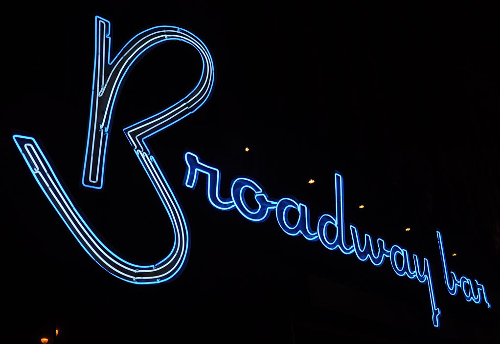 Also downtown — an oldie — probably from the 1920s or 1930s. That’s when they made those cool rope-y borders from tin (you chose the design you wanted). And the letters were installed on top of the sign panels and then neon on top of that. Possibly ripple tin (textured panel surface) — hard to say since it’s probably been painted over a few hundred times. These signs may be just text — but they are so rare and wonderful. And seldom still lit.