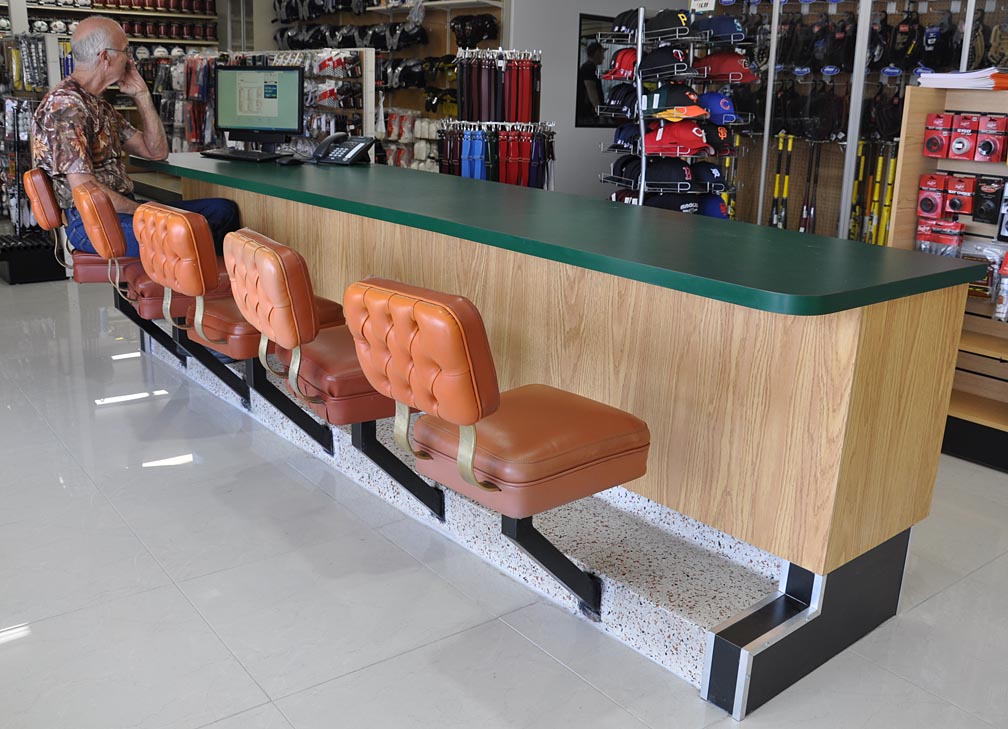 I swung by today to see if they had opened. Yup, on Monday. Here’s the counter which was saved from the restaurant. Actually, the counter is new — but the terrazzo foot rest and the hardware and stools were saved. It appears only the butt-touching parts of the seats were reupholstered. The counter will be used for order-taking & such. Here’s a shot of the counter/stools from when it was Goody’s: