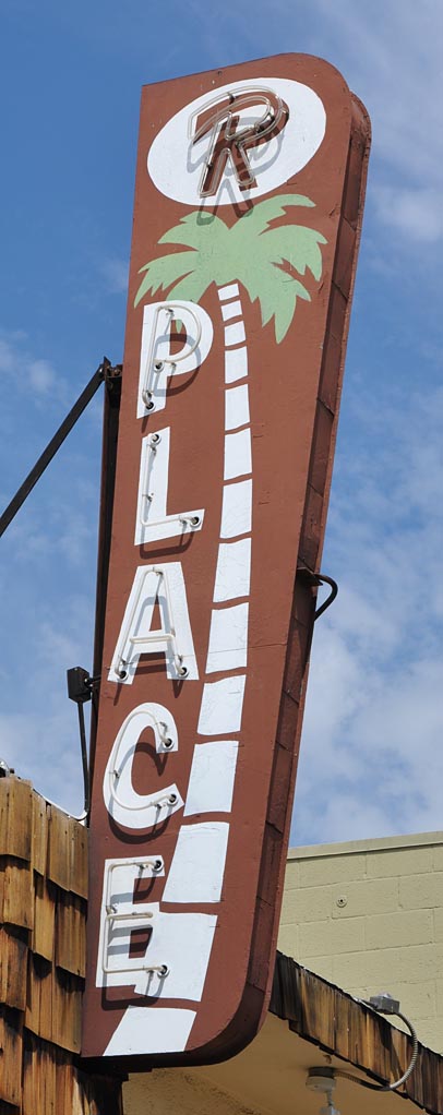 Also Pasadena — a nifty sign — the bar still there. These metal cylinders with holes would have had bulbs inside (maybe they still do?):