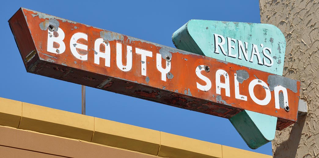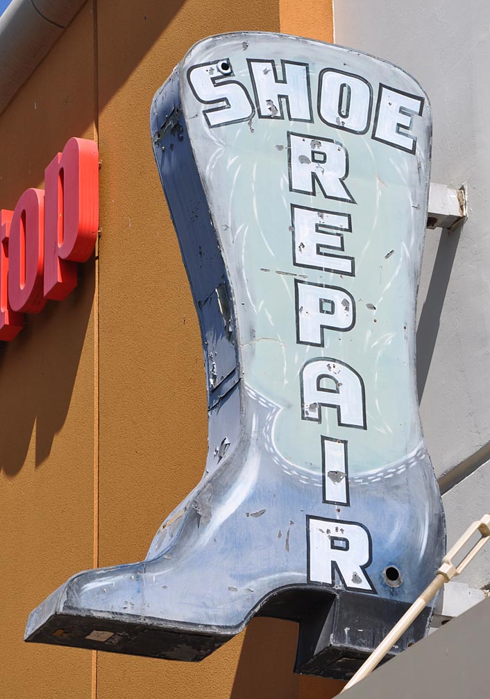 I was happy to FINALLY check this place out in Rancho Cucamonga. It’s been on my list for years. Around 2005, Victoria Gardens, a modern kinda upscale shopping center, was built. To create a sense of “layered history”, they installed a dozen or so vintage signs here and there. I have no idea who collected the signs or where they came from. They’re installed high enough so as not to confuse customers about what is sold in what store. But being up-high presented photo-taking challenges because of trees and the angle of the sun. I’ll give you a few here and then the rest of the collection at my website in a month or so.