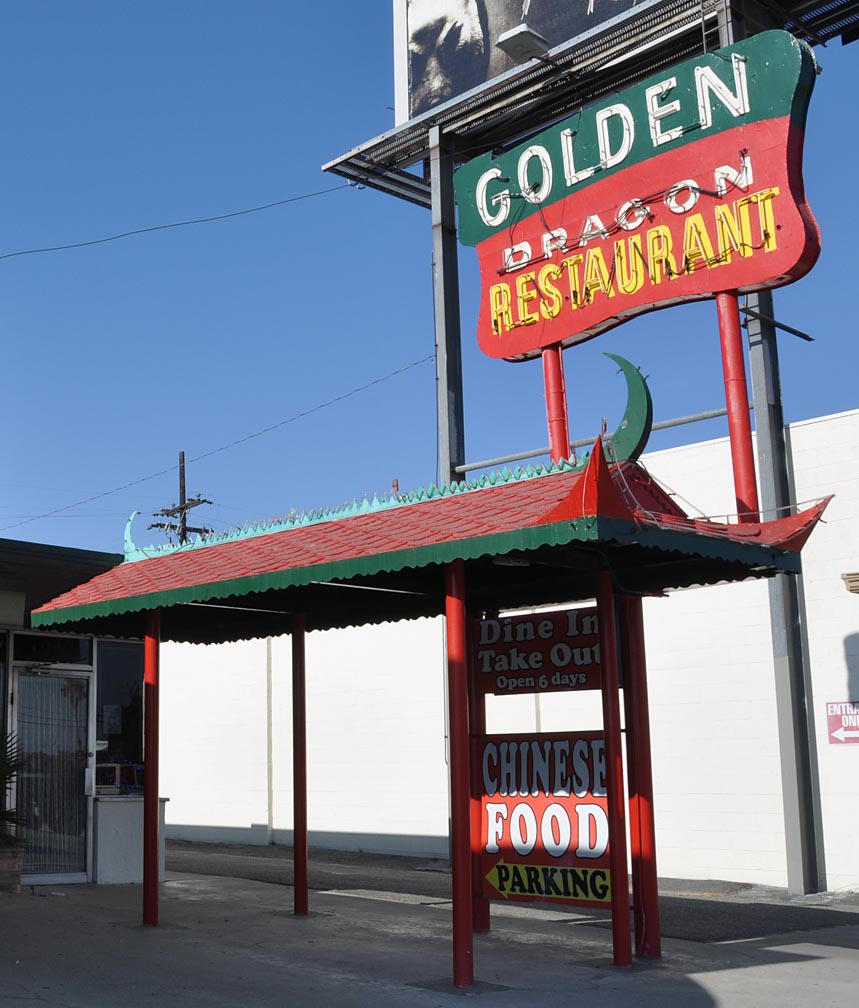 Still in Riverside. A crusty but wonderful Shakey’s sign. The red has faded to pink. Sssshhh — don’t let “corporate” know about it! Notice the neon that spells out “Shakey’s” on the side of the sign. I don’t think I’ve ever seen that before. This photo link shows that the sign was lit in 2009 — so it might still be now: