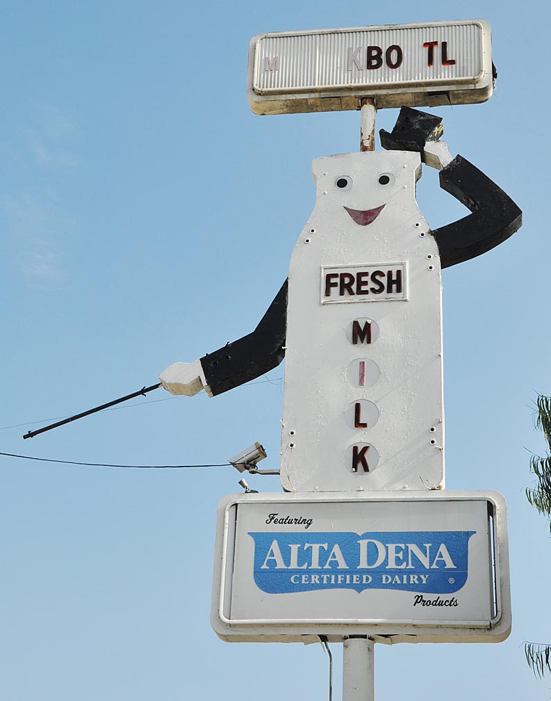The Mr. Milkbottle sign in Pomona is still there — missing some letters and neon: