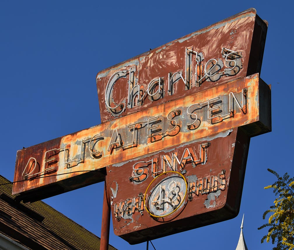 On to L.A. This from that little section between Beverly Hills and Hollywood with lots of Jewish businesses like these. Glad to see that Charlie’s is still open and this sign is still there. Unfortunately, the sign’s buddy “Beverly Wood” here in this 2008 photo, has been whitewashed (painted over with white paint):
