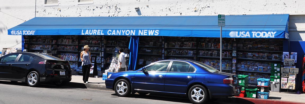 Before I moved to NYC, this is what I thought newsstands were. But now back in California, these seem so wild. In NYC, they are little six foot by four foot booths crammed with soda, cigs, candy, condoms, aspirin, stamps, and probably kiddie porn if you ask for it. There used to be so many more of these things in Hollywood. I guess that high glitz tourist junk is driving them out with higher rents and “beautification”. Unless I’ve just been missing them.