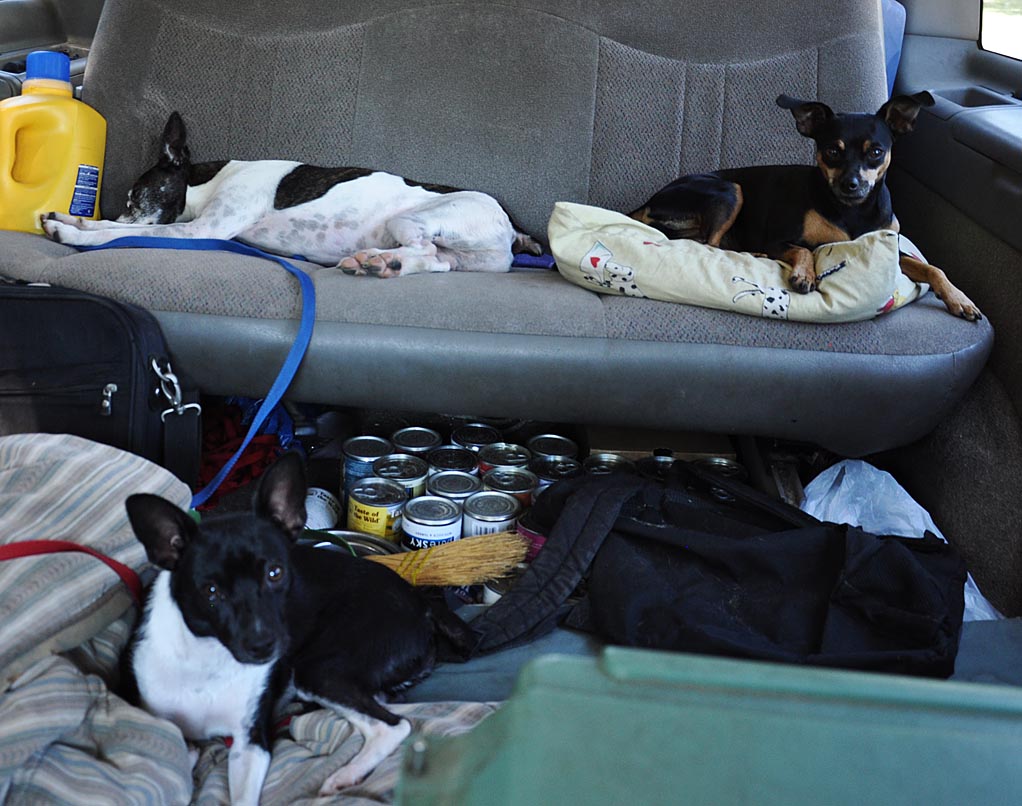We toughed out the heat until 11:30 when the temperature broke 80 degrees. I think it got to mid-90s today. Ridiculous hot for us anyway. I indulged in A/C which works decent enough and makes everybody sleepy. A blurry, over-the-shoulder at-a-light shot — but I’ll throw it into the mix. Fixie was up front with me laying in the sunny passenger seat, panting like mad even though the A/C was blowing right on her. Yes, that’s canned dog food under the seat — a couple weeks’ worth. I rarely feed these guys at home. Meals are usually served in the van after they run around.