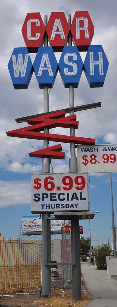 During the week, I had to run an errand for my boss. While I was there in the Valley I ran into this little gem in North Hollywood and fortunately had my camera with me. The car wash is a big empty lot now so I expect this sign will disappear any day now: