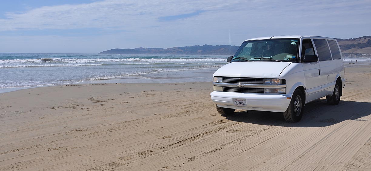 You can drive on the beach in Grover Beach for 5 bucks. I, myself, never miss the chance to drive on the beach when I can. It makes the dogs bonkers though because they just ASSUME we will be getting out momentarily. Most drive-on-the-beach places don’t allow dogs to get out PERIOD. This one does if you keep them on-leash. No point in walking around like that for us. I don’t know why none of them are hanging their heads out the windows here. Sparkle’s looking and feeling good! Purring like a kitten with her new plugs & wires & all that — and with her recent front bumper paint job (some of you may recall a very unfortunate incident in New Mexico last year):