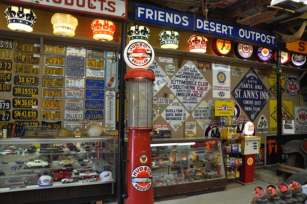 Lots of indoor rooms jammed packed with pumps & globes, signs, etc.: