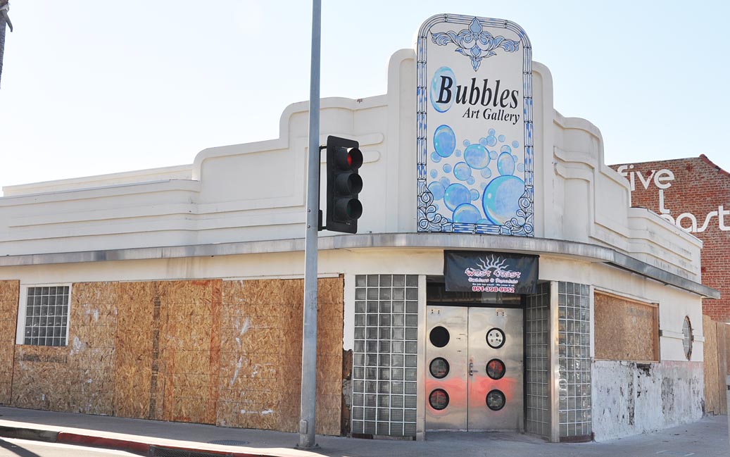 I’ve never been able to get the history of this building — other than that it was the Bubbles Balboa Club in the mid-1980s. When that closed, it became the Bubbles Art Gallery. I don’t know if this was originally a Streamline Moderne probably 1940s building — or if it was just a Disney-like impersonation of one.