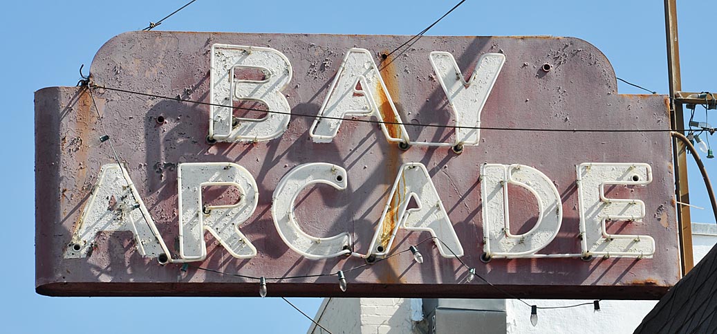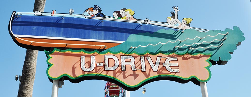 A couple more photos from Newport Beach before I close out this post. According to a plaque, this sign was built in 1933 and then restored in 2009. “Restoration” means different things to different people. I think in this case, we’re talking recreated or at least repainted panels and new neon. I have never seen a night photo of the sign so I suspect it’s no longer lit. I wish I knew more about this sign and what it advertised. Like, if this was a kiddie ride sort of thing or if it was truly a boat rental business. Today, the sign is located right next to the ferry to Balboa Island — and just a few steps away from all sorts of rides and food stands: