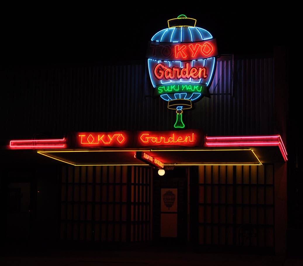 I always wanted to see this one at night in Lompoc. Unfortunately, the rice bowl sign on top is barely lit: