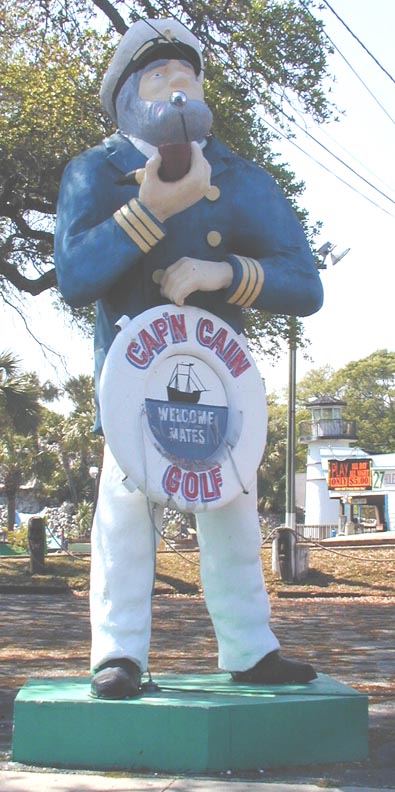 Cap’n Cain Golf, a mini golf in Myrtle Beach, SC, was closed for many years. I’d heard that the course and statue would be demolished in 2007. However, apparently not! It reopened last year and the Cap’n has been given a new paint job & some TLC. I am SO happy about that. With all the continuous new development there, I’d assumed it had been leveled for another Spring Break bar. Here’s the Cap’n in 2004 (sorry about my really crappy photo). He appears to be concrete — but there could be fiberglass under there. I have always been suspicious that he started out as an International Fiberglass Pioneer statue: