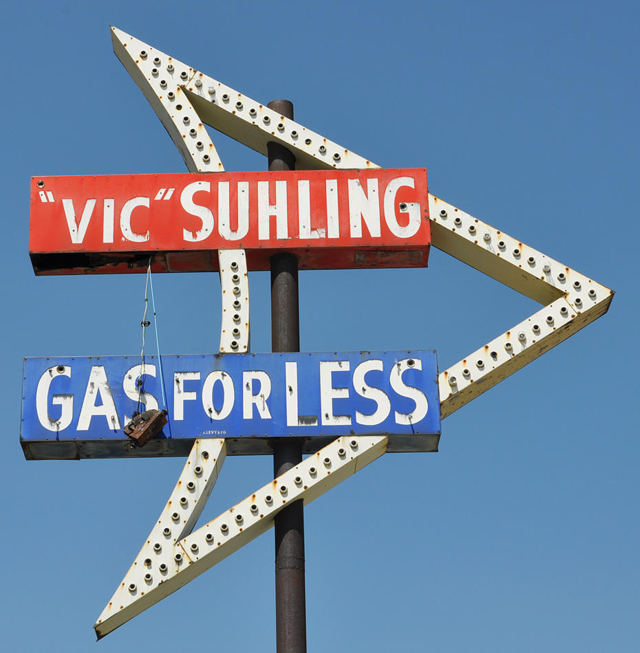 The Vic Suhling Gas for Less sign in Litchfield, IL has been standing on a vacant lot, abandoned and missing its neon & bulbs for decades. Here’s my photo from 2010: