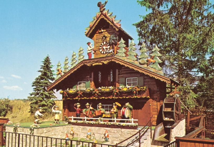 Here’s another thing that seemed doomed until very recently: the World’s Largest Cuckoo Clock. It was built from 1962-1974 for the Alpine-Alpa Cheese House in Wilmot, OH. The clock is about 24 feet wide. Here’s a vintage postcard of it: