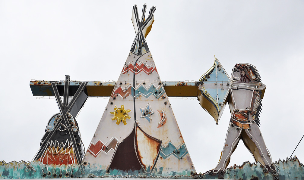 Fortunately, the Wigwam’s neon Indian sign from the 1950s was saved and has been repurposed. Here’s my dreary weather photo of the sign from 2010 just before the dozers arrived: