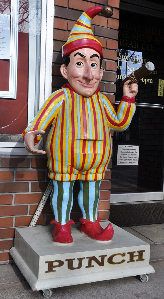 Also in Morgan Hill. I have no idea how old this Punch statue is — probably not very — but I thought he was pretty neat. He is located in front of a cigar store. I think he would have held a cigar box in his right hand. I have no idea what that indentation in his belly is about. Evidently, there’s a history to these statues — an oldie here: