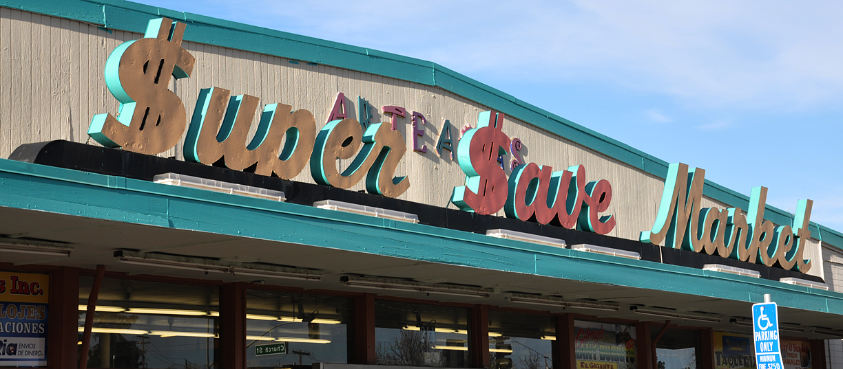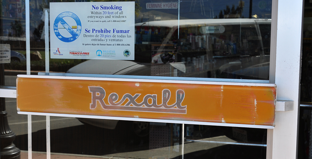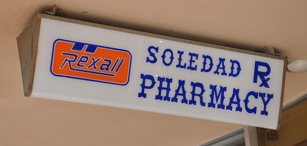 Back inland for a bit. This drug store in Soledad has one of those nice navy and orange neon Rexall signs: