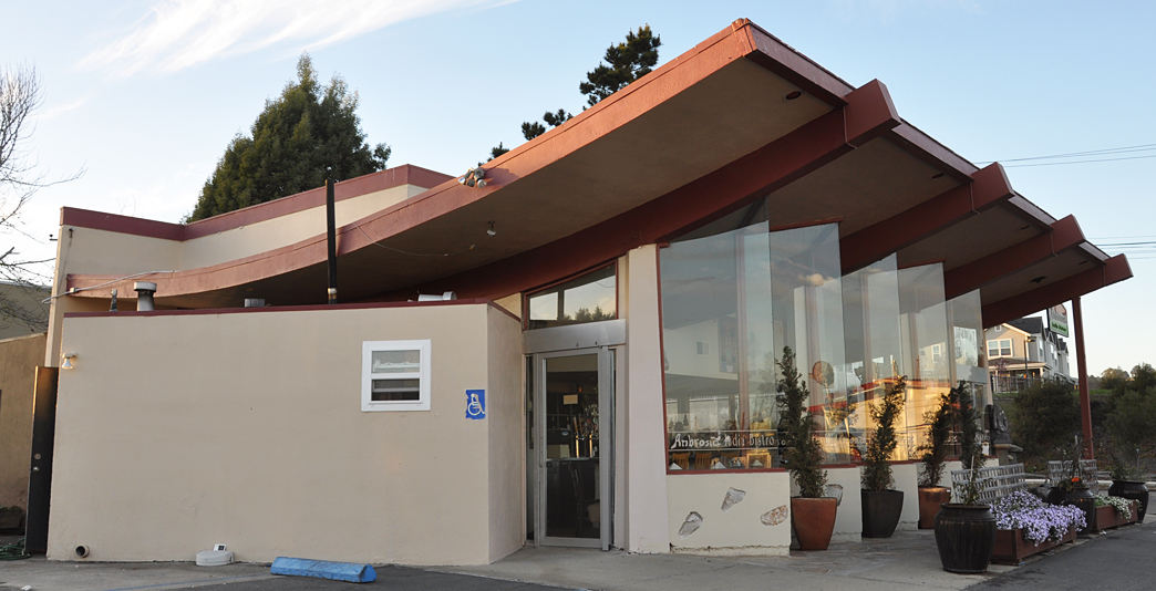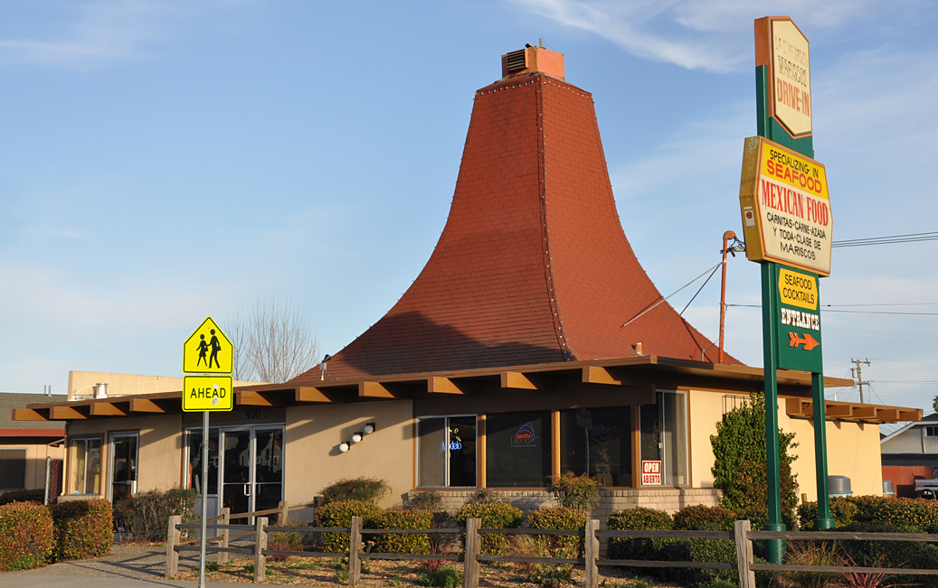 Let’s close out with another mystery — this one from Aptos. Just north of the Sno-White Drive-in is this mid-century beauty. It now houses the Ambrosia Indian Bistro (I was hungry and tempted — but opted for onion rings at the Sno-White). I don’t know if that triangulated glass is original (most likely not).