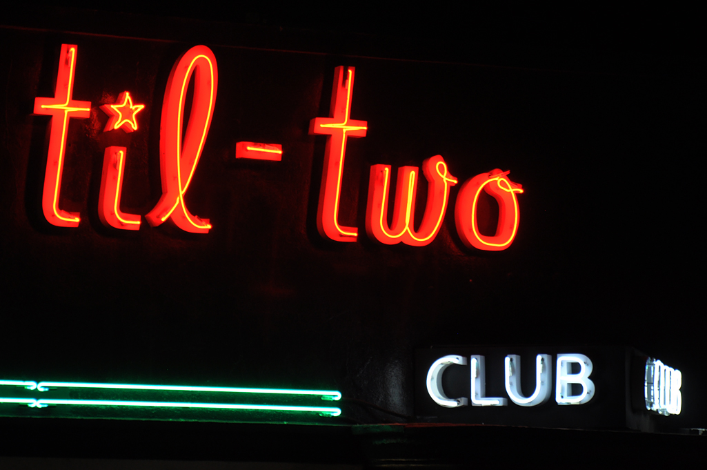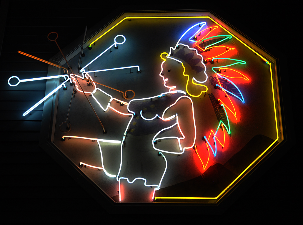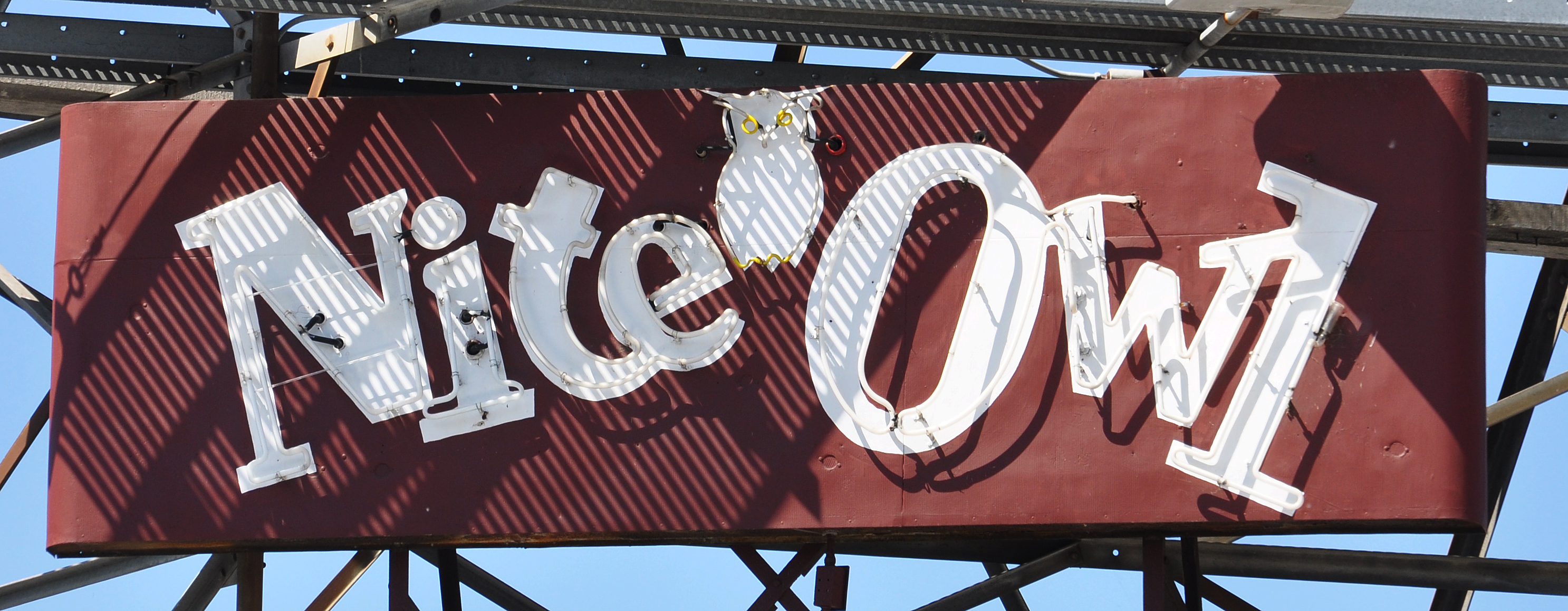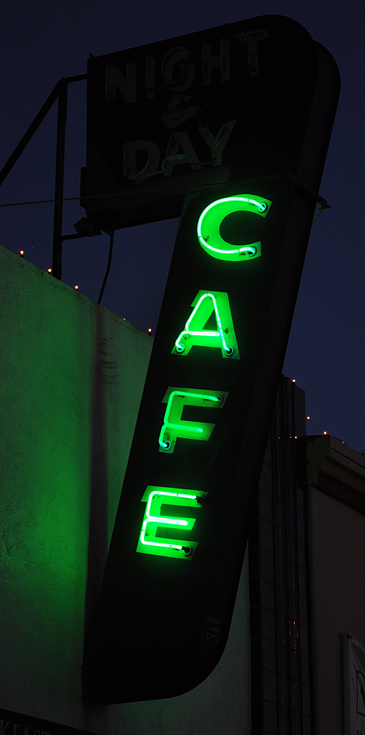 I suspect from the tubing holes and the font style that this is a reworked sign. Impossible to get a good shot during the day since it’s under billboard scaffolding. Pretty at night though: