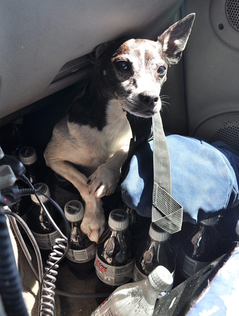 Nik is obsessed with sleeping in caves — tight, dark corners. In my apartment, he likes to sleep in the linen closet. Most of the time, on roadtrips, he wedges himself in the very back of the van in a corner with some blankets. But on this trip, he discovered what I call the “bed of nails”. A new cave in the passenger front seat floor where he sleeps on my stash of Diet Coke bottles. It can’t be comfortable. Note the squashed ear on the left.