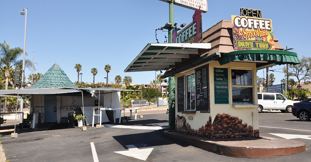 Two kiosks on one corner. The one on the right appears to be a former Fotomat. The one on the left is a flower stand with a faux thatched roof: