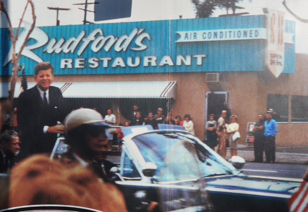 This 1963 photo of JFK in a motorcade passing by Rudford’s is installed on the side of the building: